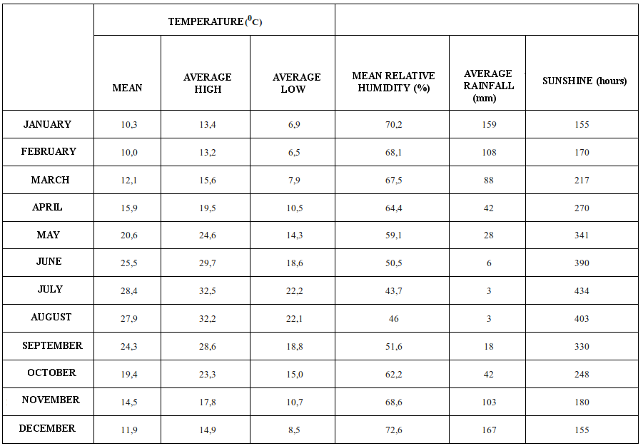 The climate of Samos island is mild and wet in winter, while in the summer is dry. Samos is one of the sunniest places in Europe, with about 3300 hours of sunshine a year (or 74% of the year). The following table shows statistics for mean temperature, average maximum temperature, average minimum temperature, mean relative humidity (%), average rainfall and sunshine hours per month on Samos island.